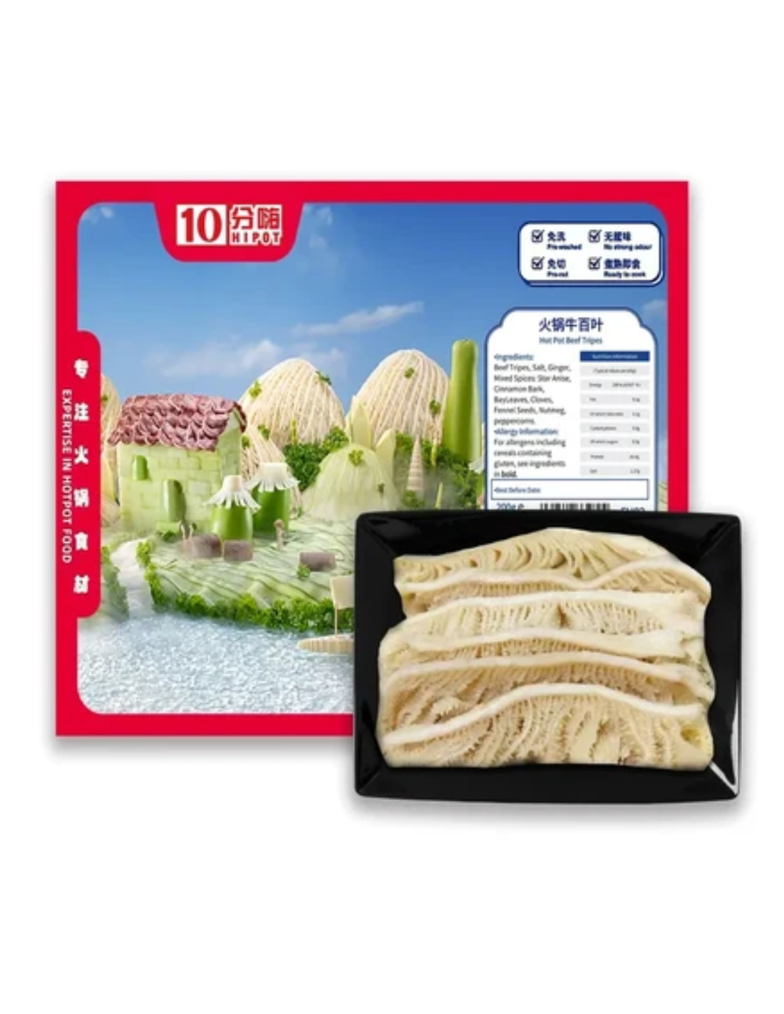 Hotpot Beef Honeycomb Tripe : Features fresh beef honeycomb tripe cut into thin strips, pre-marinated with traditional spices for enhanced flavor and aroma.