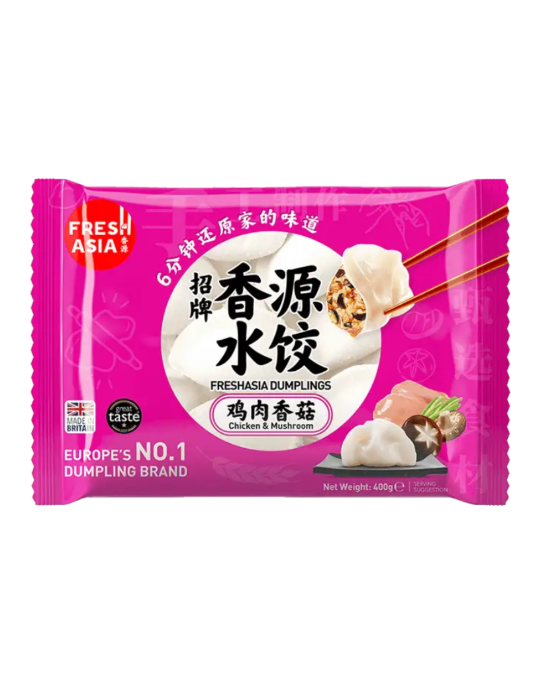 Wheat Flour, Minced Chicken (26%),Water, Chinese Mushroom (9%), Cabbage, Starch, Vegetable Oil, Spring Onion, Onion Ginger, Salt, Soy Sauce (Water, Salt, Soybeans, Wheat Flour), Gluten, Sesame Oil, Flavour Enhancer E621, Thickening Agent E1420