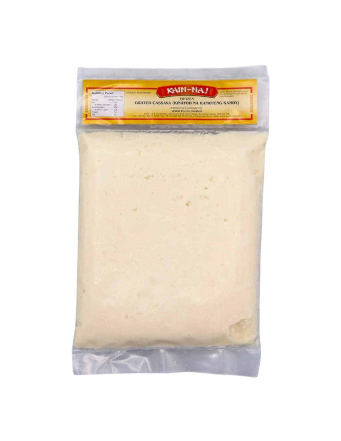 Description: Kain-Na! Grated Cassava (Kinayod Na Kamoteng Kahoy) 454g. Indulge in the authentic taste of Kain-Na! Grated Cassava, made from freshly grated kamoteng kahoy (cassava) and conveniently packed in a 454g bag. Satisfy your cravings with this delicious and nutritious treat, perfect for traditional Filipino dishes.