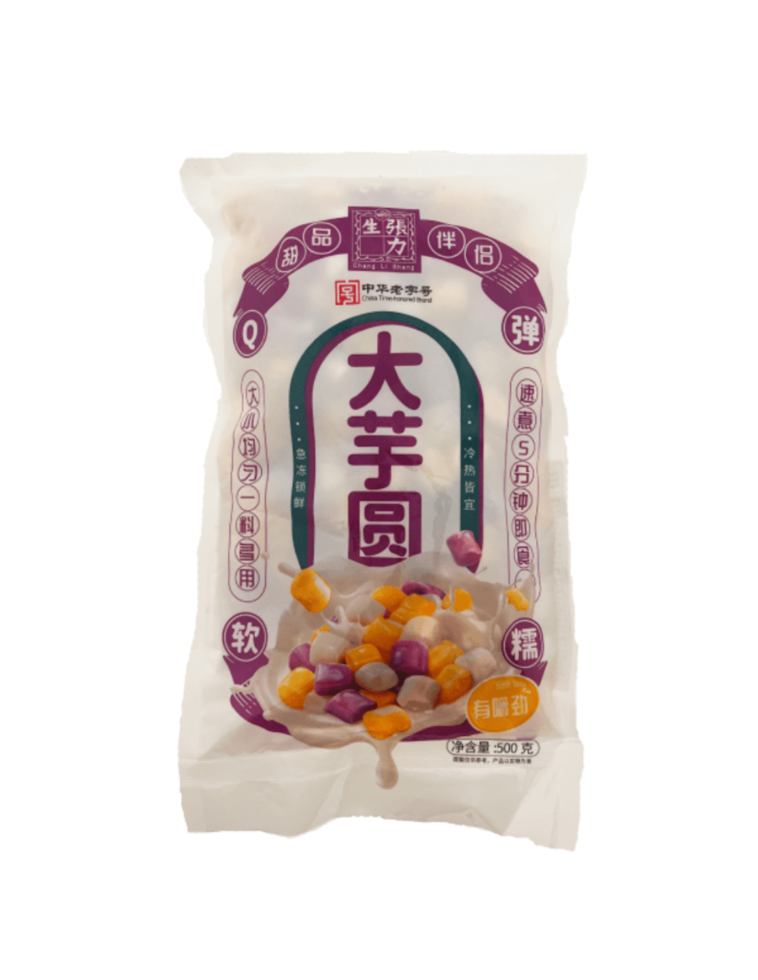 Ingredients: Water, Tapioca Starch (17%), Taro (14%) Sweet Potato (14%), Purple Sweet Potato (14%), Thickener (E1412, E412), Sugar, Cocoa Butter Substitutes, Flavouring