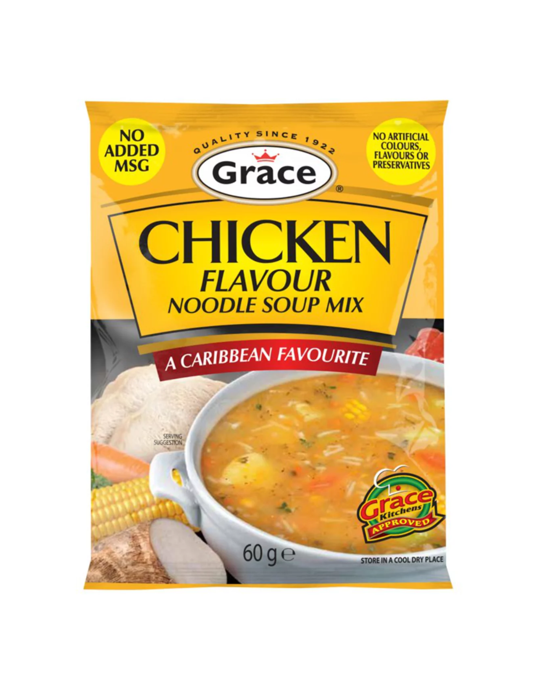 Description: Grace Chicken Flavour Noodle Soup Mix 60g. Grace Chicken Flavour Noodle Soup Mix 60g offers a convenient and flavourful solution for a quick meal. This carefully crafted blend combines savoury chicken seasoning with noodles, delivering a balanced taste and satisfying texture. Ideal for those seeking an easy-to-prepare soup without compromising on authentic flavor, it provides a comforting option perfect for any time of day.