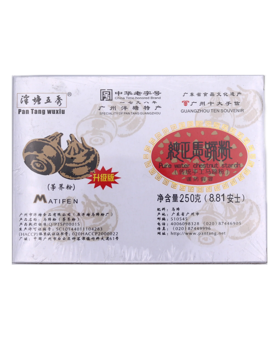 Description: PTWX Pure Water Chestnut Powder 250g. A box of water chestnut starch which can be used as a thickener. Also used as a coating for frying and it adds a nice crispy texture to the finished food. It works well for deep fried foods.