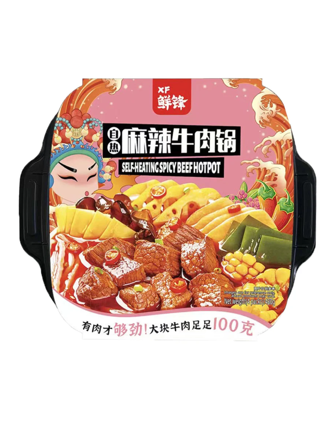 : Spicy Flavour Hotpot seasoning: Soybean oil, salt, chili pepper, broad bean sauce (chili pepper, broad bean, salt, wheat (gluten) flour), sichuan pepper, grain spirit, ginger, garlic, sugar, green onion, fermented soy bean, yeast extract, pepper, fennel, anise, cinnamon, liquorice, orange peel, flavouring flavour enhancer: E635. Pickled vegetables: Lotus root, corn, potato, kelp, black fungus, bamboo shoots, water, salt, flavour enhancers: E621, E635, acidity regulators: E270, E330, preservatives: E202, E223 (Sulphite). Cured Beef: Beef 19%, beef fat, rapeseed oil, broad bean sauce (wheat (gluten) flour), chili pepper, sichuan pepper, fermented soybean, spices. Fresh sweet potato vermicelli: sweet potato starch, pea starch, water.nn