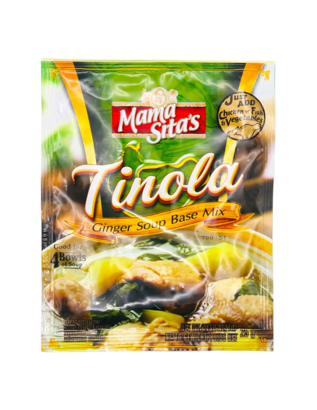 Description: Mama Sita's Tinola Ginger Soup Mix 25g. Expertly blend of Mama Sita's Tinola Ginger Soup Mix adds a burst of flavour and aroma to your traditional tinola dish. This 25g packet brings out the best of your soup, making it the perfect balance of tangy, savoury, and comforting flavours.