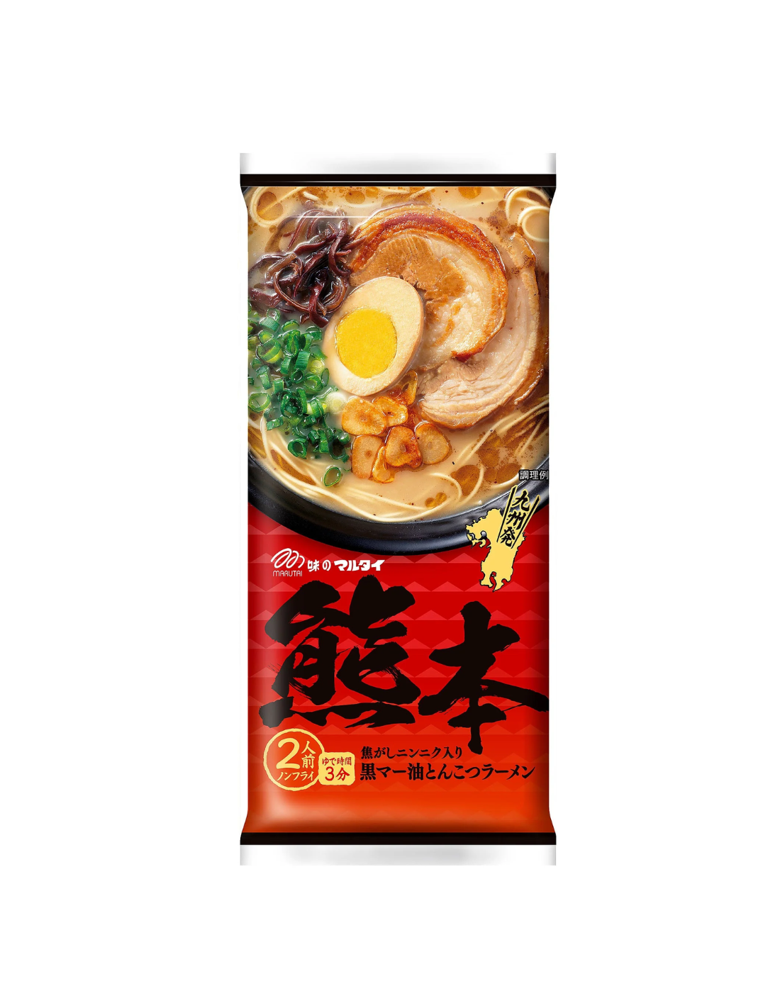 Kumamoto Ramen features straight noodles made by non-fry, non-steam method. The rich garlic pork bone soup is enhanced with seasoning oil which is specialty of Kumamoto. The seasoning oil is made with garlic fried and smashed with lard and vegetable oil until it turns black. Net content: 2 servings.