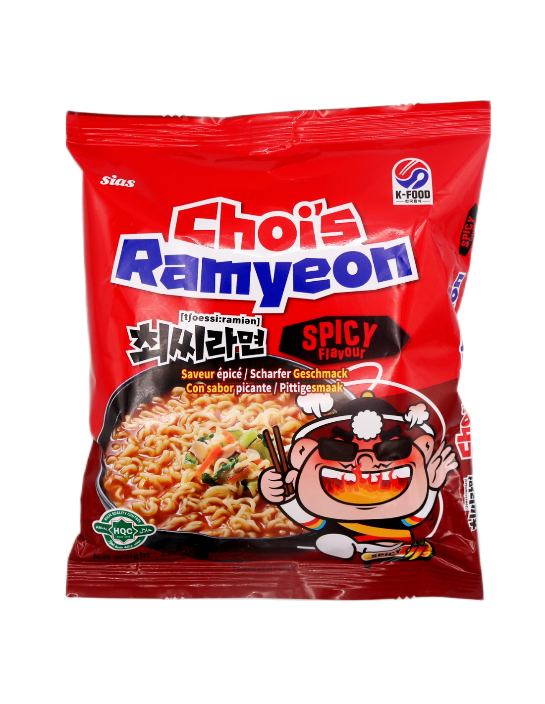 Description: Sias Choi's Ramyeon Spicy Flavour (Spicy) (Pack) 112.5g. Sias Choi's Ramyeon Spicy Flavour brings fiery Korean noodle tradition to your table in a 112.5 pack. These instant ramyeon noodles pack genuine heat and bold spice, delivering an authentic kick that satisfies serious spice enthusiasts. Quick to prepare and bursting with flavour, they're perfect for late-night cravings or a speedy meal that doesn't compromise on taste. Experience the unmistakable intensity of Korean spicy ramyeon whenever hunger strikes.