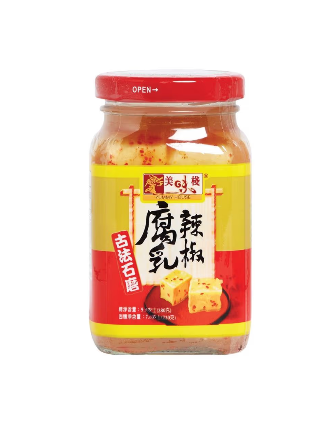 Yummy House Fermented Beancurd (Chilli) is a bold and flavourful variation of the classic Chinese condiment. Made from fermented tofu cubes and infused with a spicy chilli brine, it offers a creamy texture combined with a fiery kick that tantalises the palate.