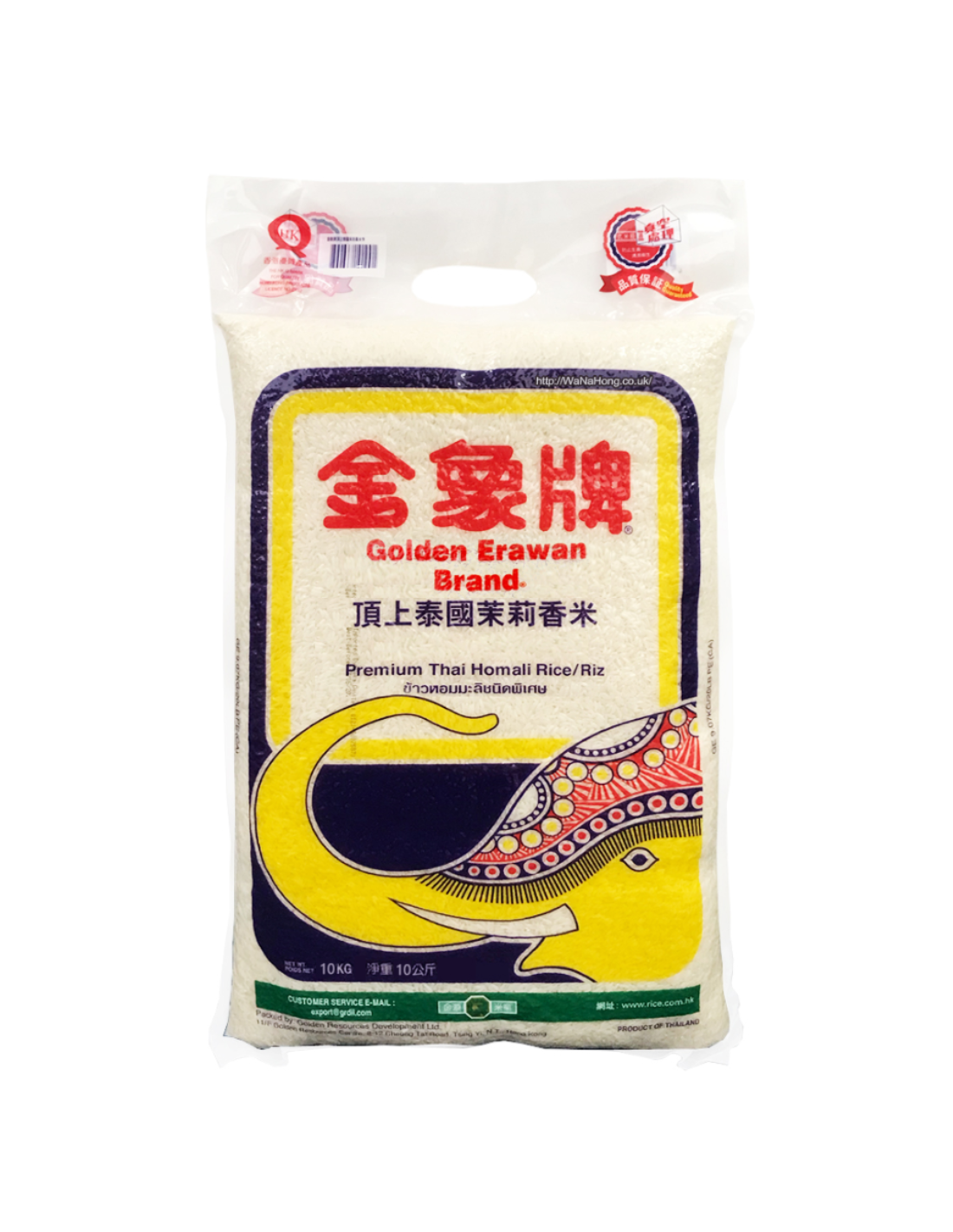 Golden Elephant (Erawan) Brand Premium Thai Hom Mali Rice is a superior variety renowned for its fragrant aroma, delicate texture, and exquisite taste. Grown in the fertile plains of Thailand, this rice is carefully cultivated and harvested to ensure the highest quality. The Hom Mali rice, also known as jasmine rice, is prized for its distinctive floral scent reminiscent of jasmine flowers, which infuses dishes with a delightful aroma. With its slightly sticky texture when cooked, it is perfect for various Asian cuisines, including Thai, Chinese, and Vietnamese dishes. Whether served alongside savoury curries, stir-fries, or enjoyed on its own as a simple yet flavourful side dish, Golden Elephant (Erawan) Brand Premium Thai Hom Mali Rice is a staple in households and restaurants around the world, embodying the rich culinary heritage of Thailand.