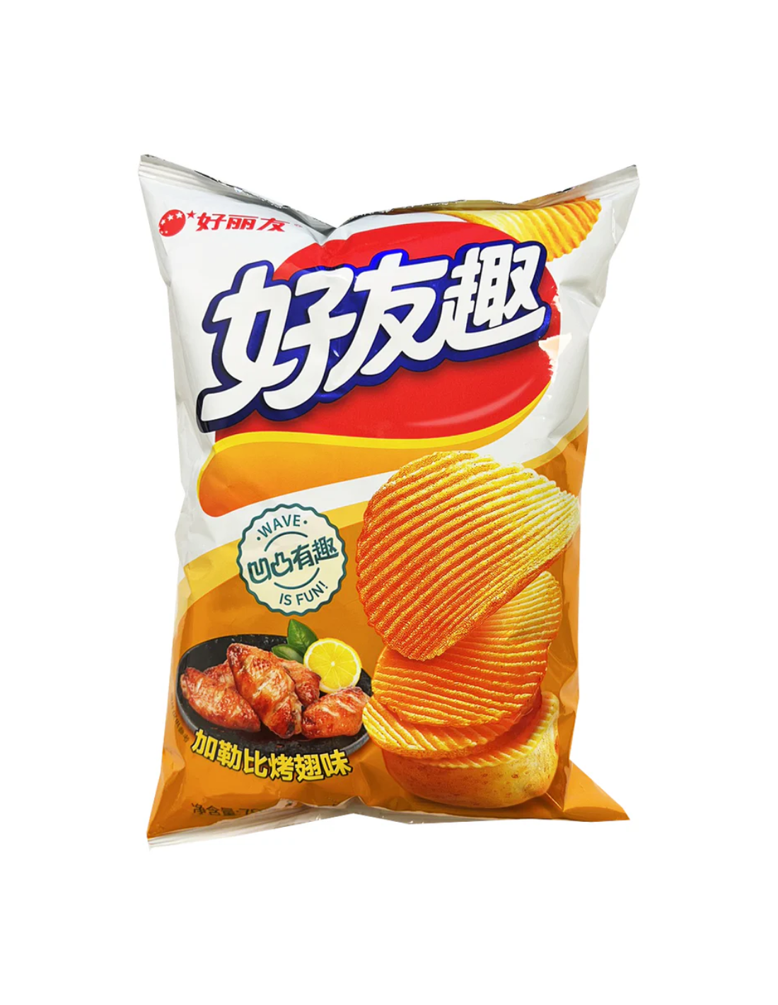 Potato, vegetable oil, Caribbean grilled wing flavour seasoning (sugar, salt, spices, soy sauce, starch, E965, E228, E330, yeast extract, hydrolysed vegetable protein, vegetable oil, E635, E160a, glucose, chilli oil, E296, antioxidant: E307). May contain wheat, egg and soy product.