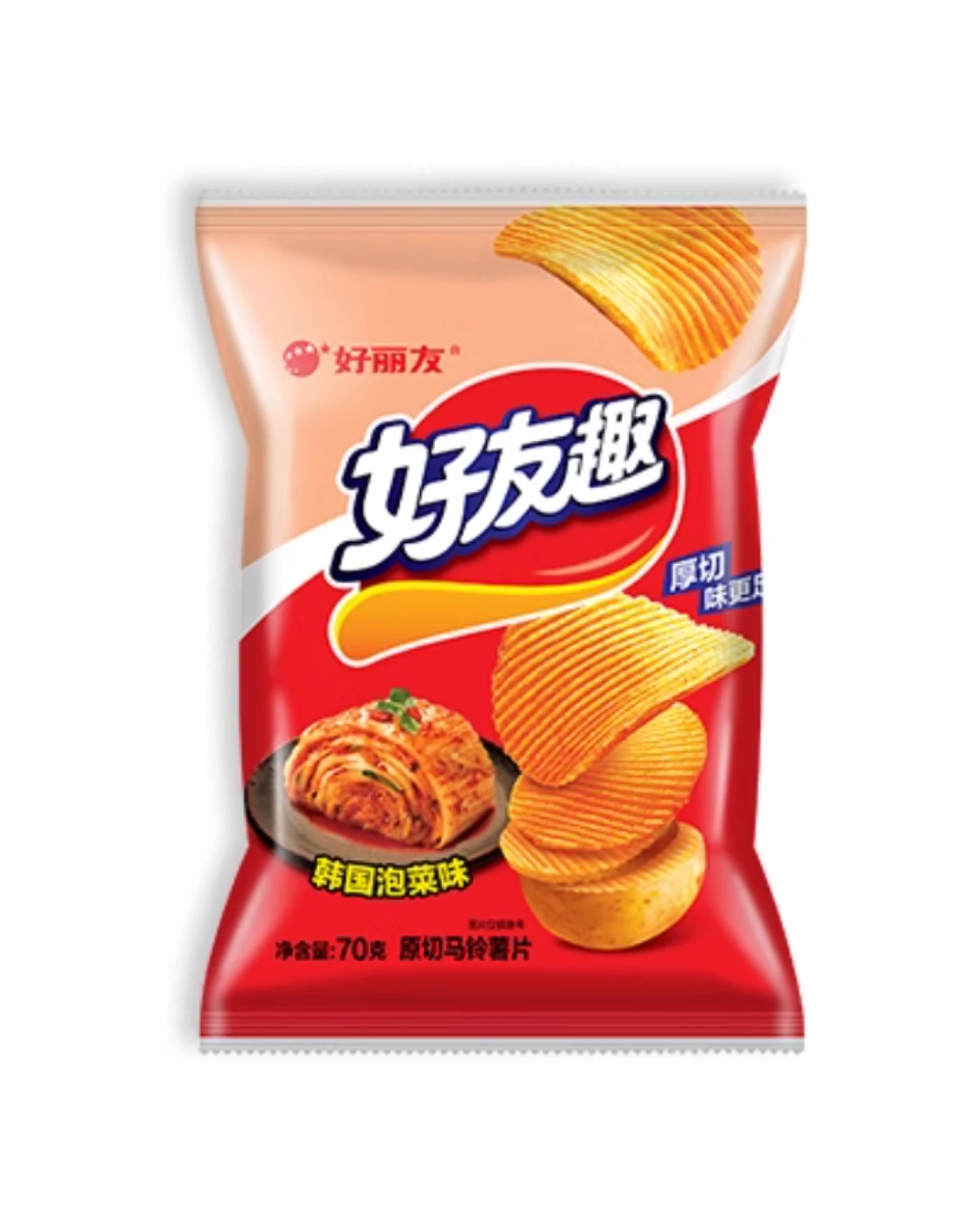 Potatoes, vegetable oil, Korean kimchi flavouring (sugar, salt, whey powder, flavour enhancer: E621, E635, E951) (containing pheylalanine), edible flavouring, brewing soy sauce, maltodextrin, chilli powder, antioxidant (E330, emulsifier: E551, colour: E160c.