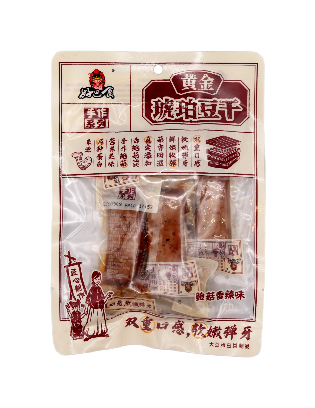 Description: HBS Beancurd & Oyster Mushroom Snack (Spicy) 120g. HBS Beancurd & Oyster Mushroom Snack delivers a bold, spicy flavour profile combining tender beancurd with earthy oyster mushrooms. This 120g pack offers a protein-rich, plant-based snack ideal for those seeking savoury alternatives to conventional crisps. The carefully balanced seasoning provides genuine heat without overwhelming the delicate umami notes of the mushrooms. Perfect for lunch boxes, on-the-go consumption, or as a sophisticated accompaniment to drinks. A thoughtfully crafted snack that satisfies cravings whilst maintaining nutritional integrity.