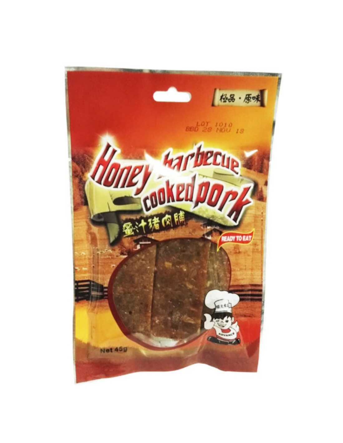 Advance Honey's Barbecue Cooked Pork is a type of "Bak Kwa", a Chinese version of pork jerky, made with thinly sliced or minced pork, seasoned with soy sauce and sugar, and grilled over charcoal with open fire. It is packaged, and ready-to-eat upon opening. A delicious, salty and meaty snack to add to your kitchen cupboard and enjoy whenever you have a craving for meat.