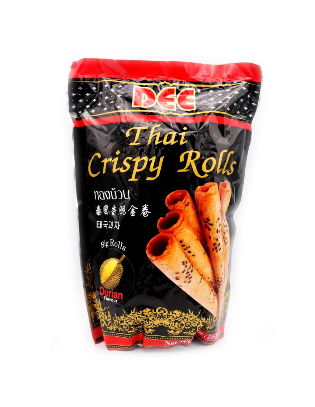 Description: DEE Thai Crispy Rolls (Durian Flavour) 150g. A bag of delicious durian-flavoured crispy rolls from Thailand, perfect for durian lovers!
