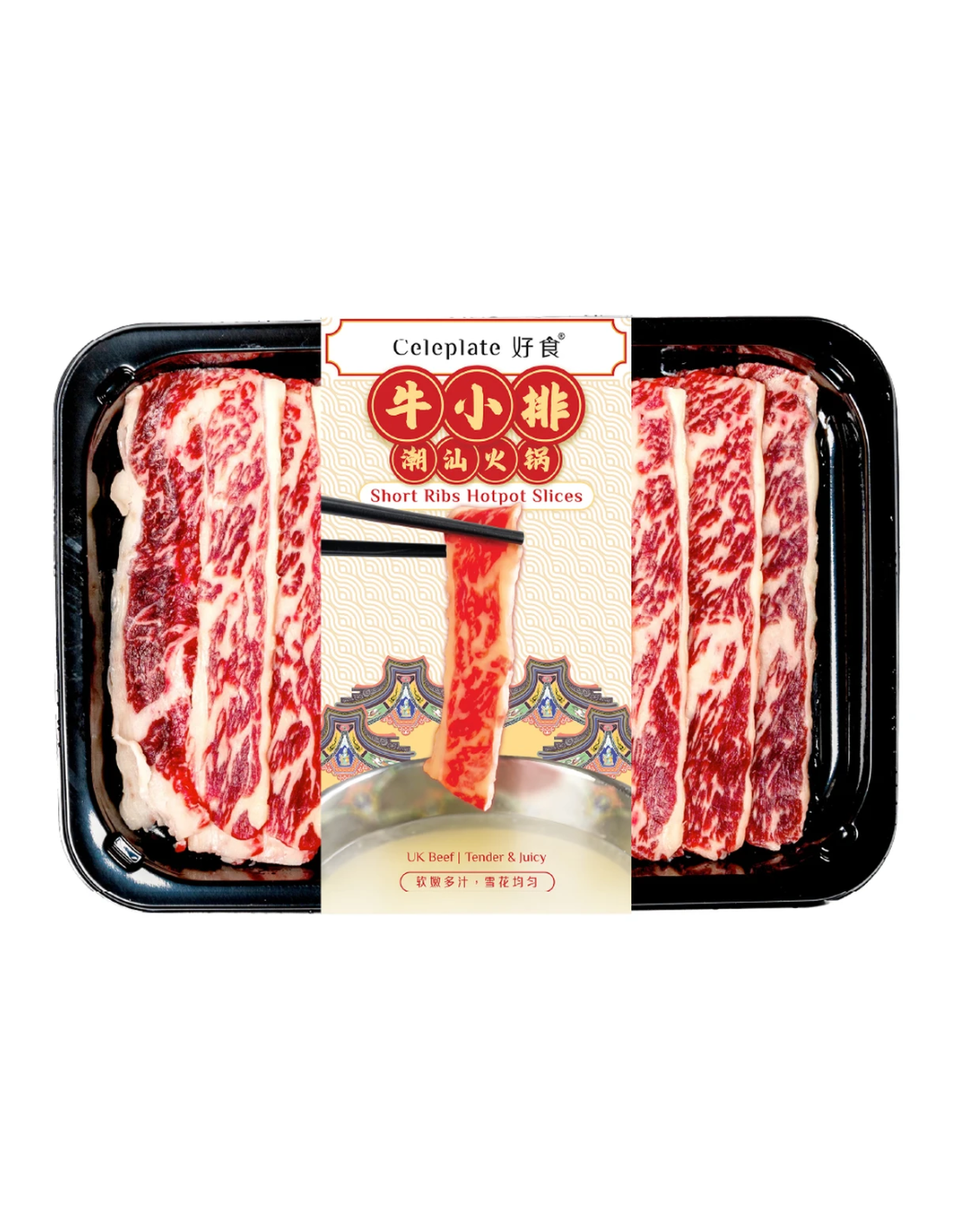 Celeplate 牛小排火锅片,精选英国优质牛小排,切成薄片,是制作东亚风味火锅的理想之选。这些牛小排来自英国值得信赖的农场,肥瘦比例完美,肉质鲜嫩多汁,牛肉风味浓郁。烹饪过程中,肥瘦相间的纹理会完美融化,为汤底增添浓郁鲜美的滋味。无论是寿喜烧、涮涮锅还是其他任何火锅菜肴,这款牛小排都能为您带来令人满足的美味体验。