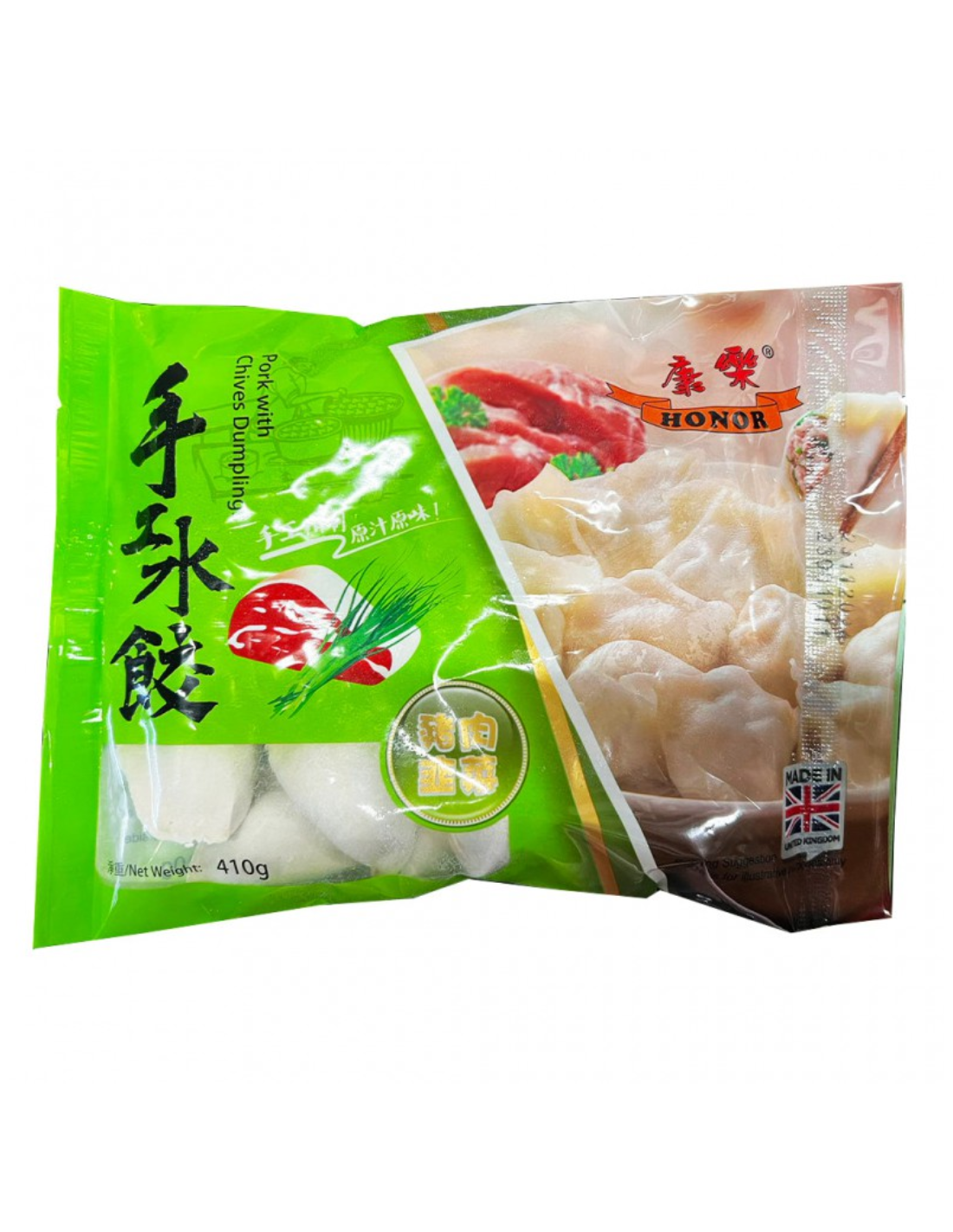 饺子皮:小麦粉30%,水。饺子馅:猪肉35%,韭菜15%,葱,菜籽油,姜,酱油(含水,大豆,小麦,增味剂(E621),小麦粉,增味剂(E635,E631),色素(E150d,亚硫酸盐,氨,焦糖),防腐剂(E211),甜味剂(E955)),老抽(含水,盐,豆粕,大豆,小麦粉,糖),鸡肉粉(含乳糖,盐,增味剂(E621,E631,E627),麦芽糊精,盐(钾),鸡肉(5.7%),改性玉米淀粉,棕榈油,糖,酵母提取物,鸡油(0.6%),调味料(含蛋),鸡肉提取物(0.1%),马铃薯淀粉,酸(乳酸)、抗氧化剂(迷迭香提取物)、色素(E150c)、增味剂(E621)、白胡椒。可能含有甲壳类动物、软体动物、芹菜、芥末、芝麻、花生和坚果。