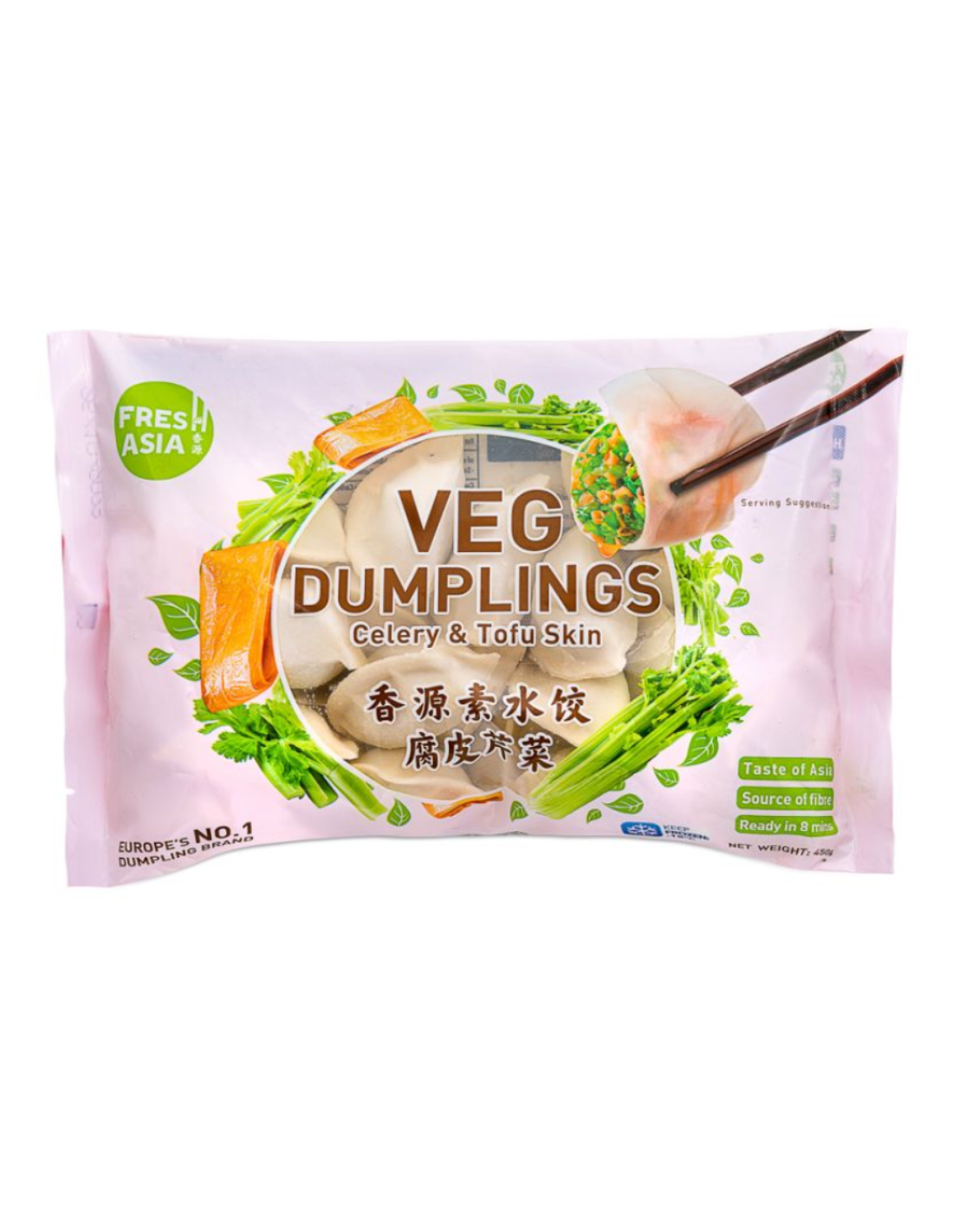 Ingredients: Wheat flour (contains gluten), water, celery (22%), cabbage, bean curd (soybean, water) (7.5%), oil (palm oil, water, emulsifier E471), onion, coriander, modified starch, wheat starch (contains gluten), salt, flavour enhancer E621, sugar, tapioca starch, peanut oil, sesame oil, emulsifier E472e, acidity regulator E500, yeast extract, flavour enhancer E635, sichuan pepper powder, white pepper.