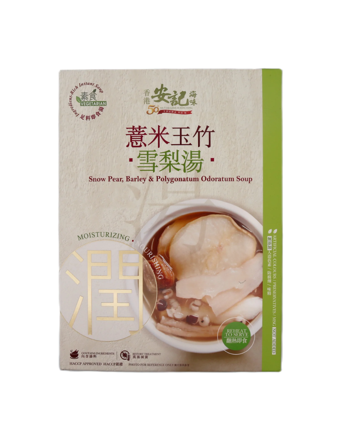 描述:安记雪梨薏米玉竹雪梨汤 400克。安记雪梨薏米玉竹雪梨汤融合了以滋补功效著称的传统食材。这款400克的雪梨汤以天然甜味和保湿功效著称,薏米有助于消化,而玉竹因其舒缓功效而被誉为草药。精心调制,带来均衡舒适的口感,让您轻松享用这道源于悠久养生传统、有益健康的滋补佳品。