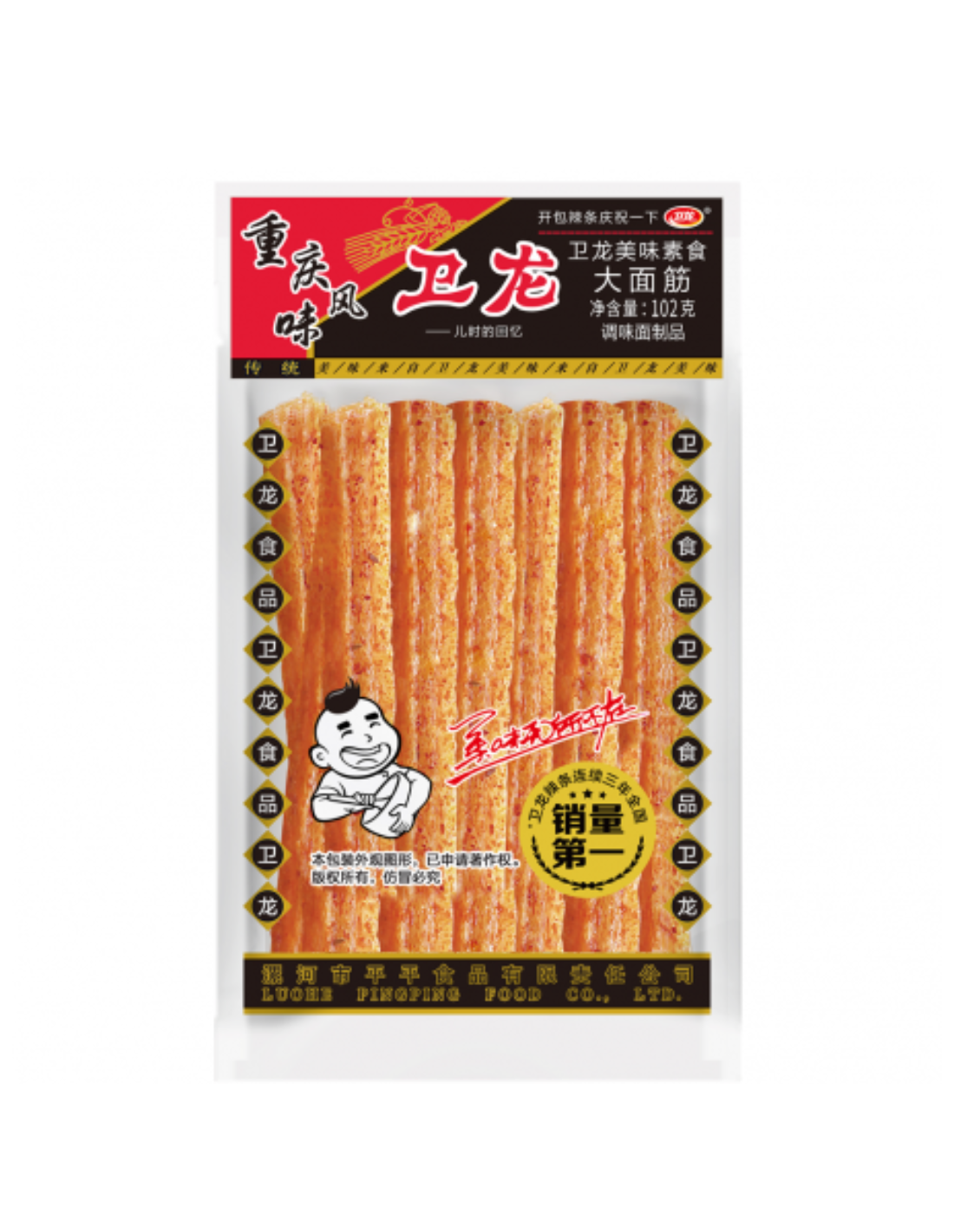 小麦粉 45%,大豆油(抗氧化剂 E319),水,保湿剂 E422、E325,盐,糖,花椒,辣椒,孜然,香辣香料(MUSTADF),乳化剂 E471,大豆纤维粉,酵母提取物,增味剂 E621、E635,甜味剂 E951、E950、E955、E961,色素 E160c。