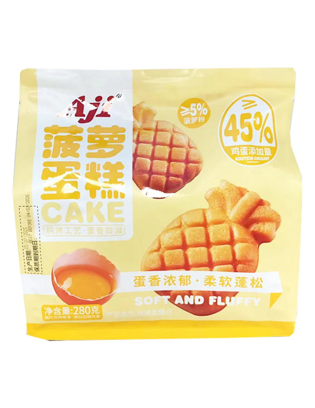 鸡蛋 (>45%)、小麦(含麸质)粉、白砂糖、植物油(大豆油)、海藻糖、菠萝粉 (≥5%)、高果糖玉米糖浆、奶粉、食用盐、小麦(含麸质)淀粉、玉米淀粉、麦芽糊精、乳化剂 (E471、E475)、改性淀粉 (E1440、E1442)、酸度调节剂 (E450、E500、E341、E330、E575、E334)、稳定剂 (E415)、增稠剂 (E412)、保湿剂 (E422)、甜味剂 (E420)、防腐剂 (E202)、食用香精。海藻糖是葡萄糖的来源。E420:过量食用可能导致腹泻。
