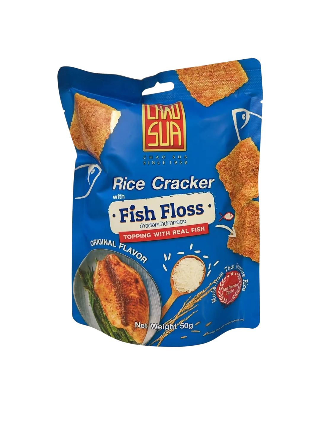 米饼(茉莉香米、棕榈油)(71%)、调味料(糖、大蒜、白胡椒粉、盐、木薯淀粉、增味剂(5'-肌苷酸二钠、5'-鸟苷酸二钠)(17%)、鱼松(金枪鱼、糖、酱油(盐、大豆、小麦粉、糖)(10%))、米糠油(2%)。可能含有:牛奶、鸡蛋、腰果、芝麻、花生、杏仁、软体动物、亚硫酸盐、芥末、甲壳类动物。